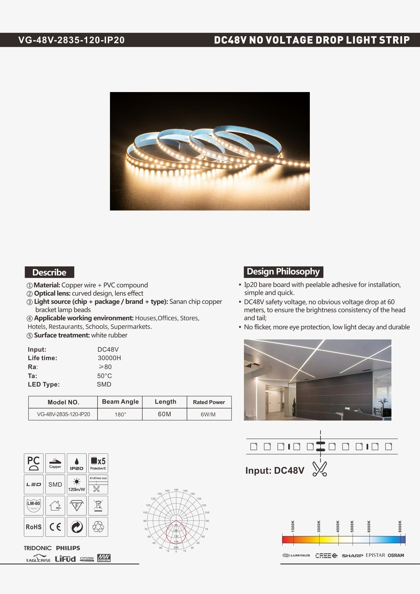 Illuminate your space with this premium LED strip light designed for ambient warmth and comfort. Operating at DC48V with an efficient 6W per meter consumption, it delivers an impressive 120 lumens per watt for brilliant yet gentle illumination. Featuring high-quality 2835 LED chips with a CRI rating of 80 or higher, colors appear natural and inviting. The flexible copper strip measures 60 meters long and 10 millimeters wide, with convenient 41.67mm cutting intervals for custom installations. IP20-rated for indoor use, it's perfect for accent lighting, shelving displays, or creating cozy atmospheres in any room. Easy to install and energy-efficient, this versatile lighting solution brings warmth to your home or commercial space.
